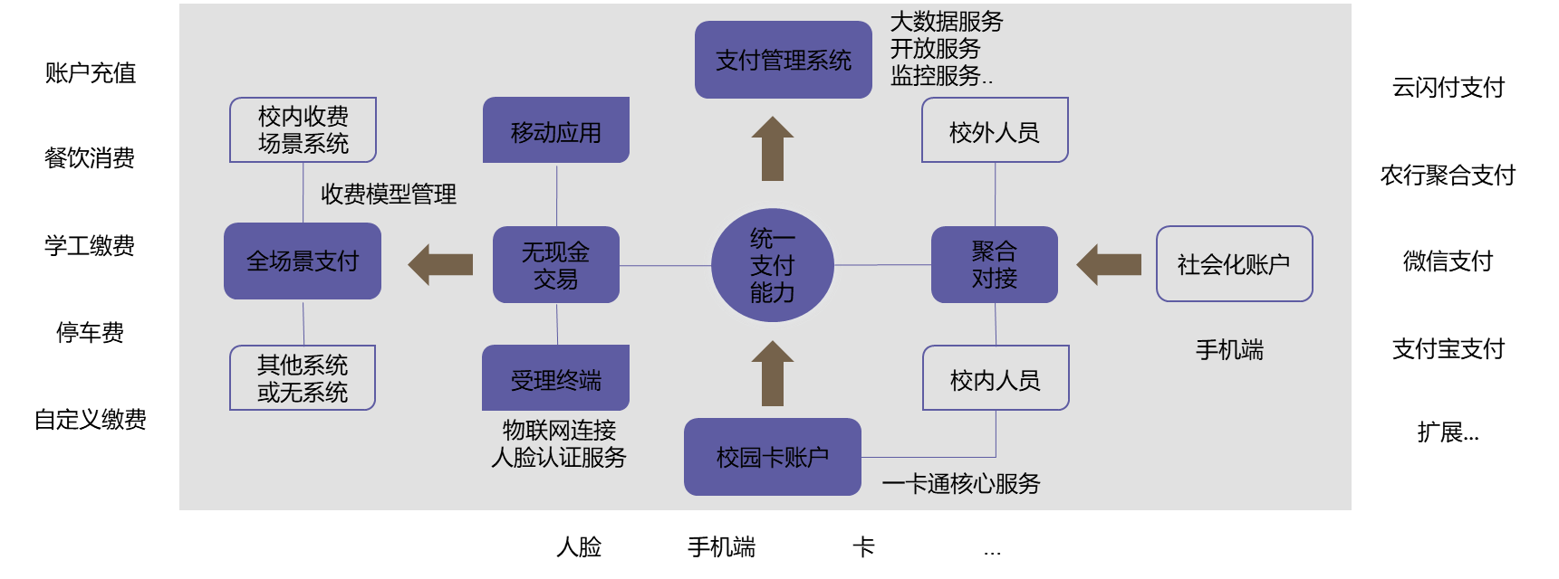隨著移動(dòng)支付與人臉支付等技術(shù)的普及,為了切實(shí)踐行“以人為本”的智慧校園建設(shè)理念,學(xué)校亟需從頂層設(shè)計(jì)滿(mǎn)足“全場(chǎng)景支付”、“高擴(kuò)展”、“高用戶(hù)體驗(yàn)”、“智能化”要求的支付業(yè)務(wù)主題的信息化平臺(tái)。 面向校內(nèi)外用戶(hù),以支付場(chǎng)景建設(shè)為核心,秉持“融合、物聯(lián)、創(chuàng)新”原則,充分利用多元化支付渠道、多樣化支付介質(zhì)(含人臉)、在線(xiàn)交易與雙離線(xiàn)技術(shù)、多收費(fèi)場(chǎng)景靈活擴(kuò)展等技術(shù)手段,覆蓋充值、繳費(fèi)、消費(fèi)、收款等校園全支付場(chǎng)景,建設(shè)學(xué)校統(tǒng)一的支付體系,打造智慧支付業(yè)務(wù)中臺(tái)。