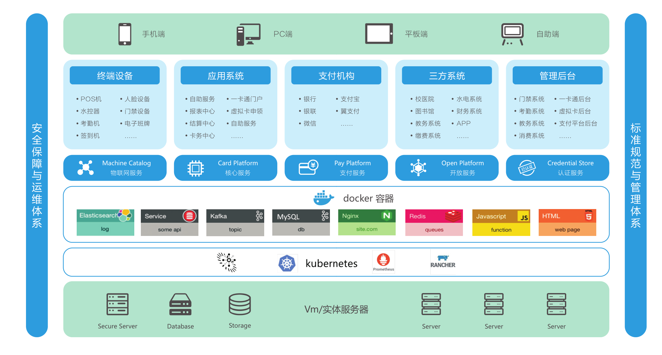 新一代校園一卡通系統(tǒng)采用“金融在線”聯(lián)機(jī)交易模式,參考銀行金融支付體系,多種介質(zhì)共用一個(gè)“錢(qián)包”,達(dá)到“多種介質(zhì)、多種支付、一個(gè)賬戶、統(tǒng)一管理”的目標(biāo),徹底顛覆傳統(tǒng)一卡通支付及認(rèn)證模式。平臺(tái)底層架構(gòu)采用 kubernetes 微服務(wù)技術(shù)和 docker 容器化部署方式,實(shí)現(xiàn)了平臺(tái)業(yè)務(wù)處理能力的大提升,可支持高并發(fā)、高容錯(cuò)、高性能、高效率,引領(lǐng)行業(yè)發(fā)展。