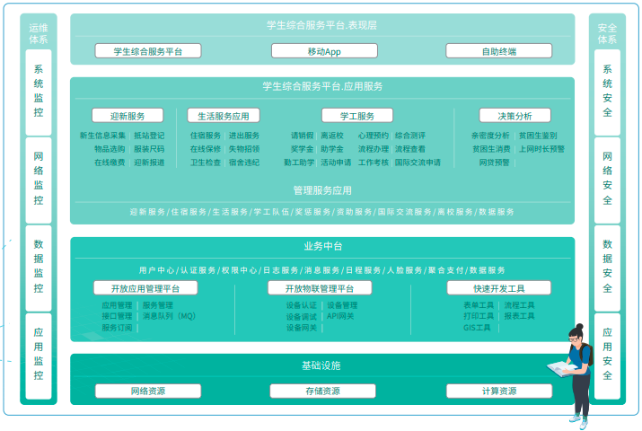 基于公司業(yè)務(wù)中臺(tái)和快速開發(fā)工具能力,快速構(gòu)建上層微應(yīng)用,如迎新服務(wù)微應(yīng)用/住宿服務(wù)微應(yīng)用/學(xué)工隊(duì)伍微應(yīng)用/獎(jiǎng)懲服務(wù)微應(yīng)用/資助服務(wù)微應(yīng)用/離校服務(wù)微應(yīng)用等;復(fù)用這些能力,可以快速高效響應(yīng)和更新,來滿足高校用戶不斷變化的需求。同時(shí)基于阿里一云多端技術(shù)為用戶提供終端服務(wù),比如學(xué)生事務(wù)一體化服務(wù)平臺(tái)、超級(jí)app、線下智能終端設(shè)備等,提升高校師生獲得信息化資源的便捷性和辦事服務(wù)的高效性。