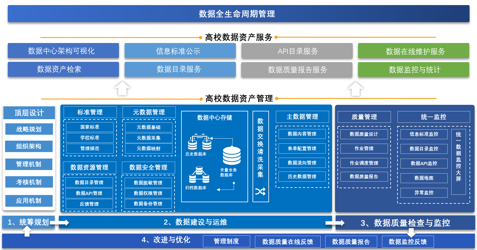而目前的高校,數(shù)據(jù)中心建設存在的大量的問題,難以滿足高校在決策、管理、服務、流程優(yōu)化、業(yè)務創(chuàng)新等多方面的要求。為此,急需進行全面的數(shù)據(jù)治理。通過數(shù)據(jù)治理可重復的迭代過程,螺旋式上升模型,實現(xiàn)數(shù)據(jù)資產(chǎn)的不斷沉淀、積累和質(zhì)量的持續(xù)提升。 高校數(shù)據(jù)中臺的建設遵循技術(shù)與管理的相結(jié)合,貫穿在數(shù)據(jù)管理的過程中。建立科學有效的數(shù)據(jù)中臺體系,對學校各業(yè)務系統(tǒng)和數(shù)據(jù)中心的數(shù)據(jù)質(zhì)量實施全程、全域和全員的管理。將數(shù)據(jù)質(zhì)量管理以制度化、規(guī)范化的方式落實到數(shù)據(jù)采集、存儲、清洗、生成、轉(zhuǎn)化、傳遞和使用的各個過程環(huán)節(jié)之中,將會成為學校信息化建設的一項重要工作。