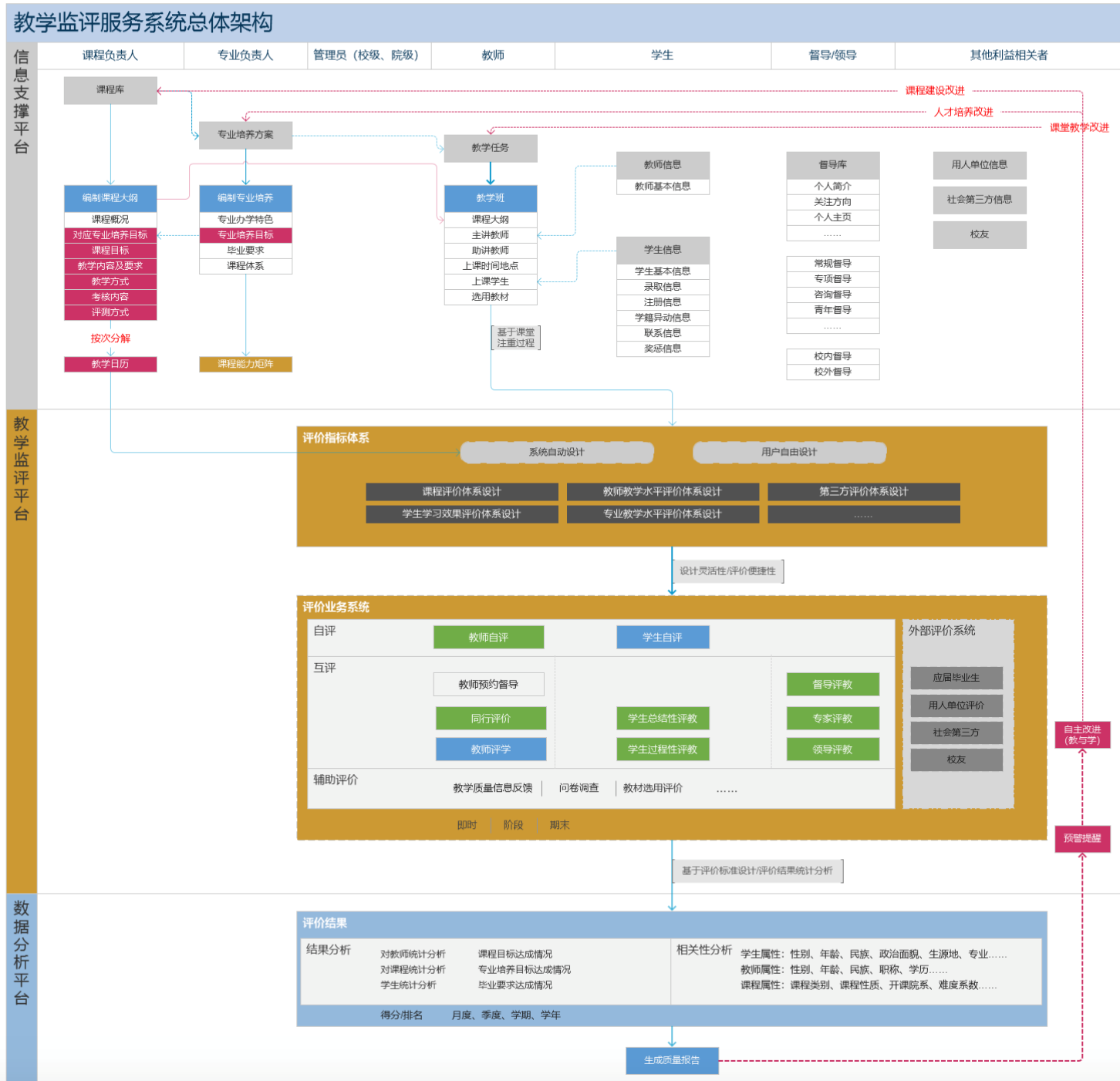 教學(xué)質(zhì)量平臺架構(gòu)的核心是從培養(yǎng)方案出發(fā),圍繞課程、教師、學(xué)生進(jìn)行質(zhì)量評估活動。