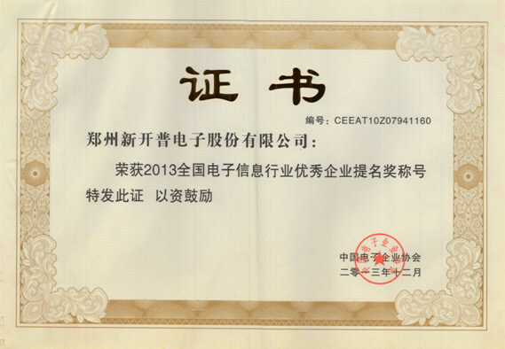 新開普榮獲“2013全國(guó)電子信息行業(yè)優(yōu)秀企業(yè)提名獎(jiǎng)”