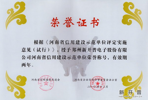 我公司被授予“河南省信用建設(shè)示范單位”榮譽(yù)稱號(hào)