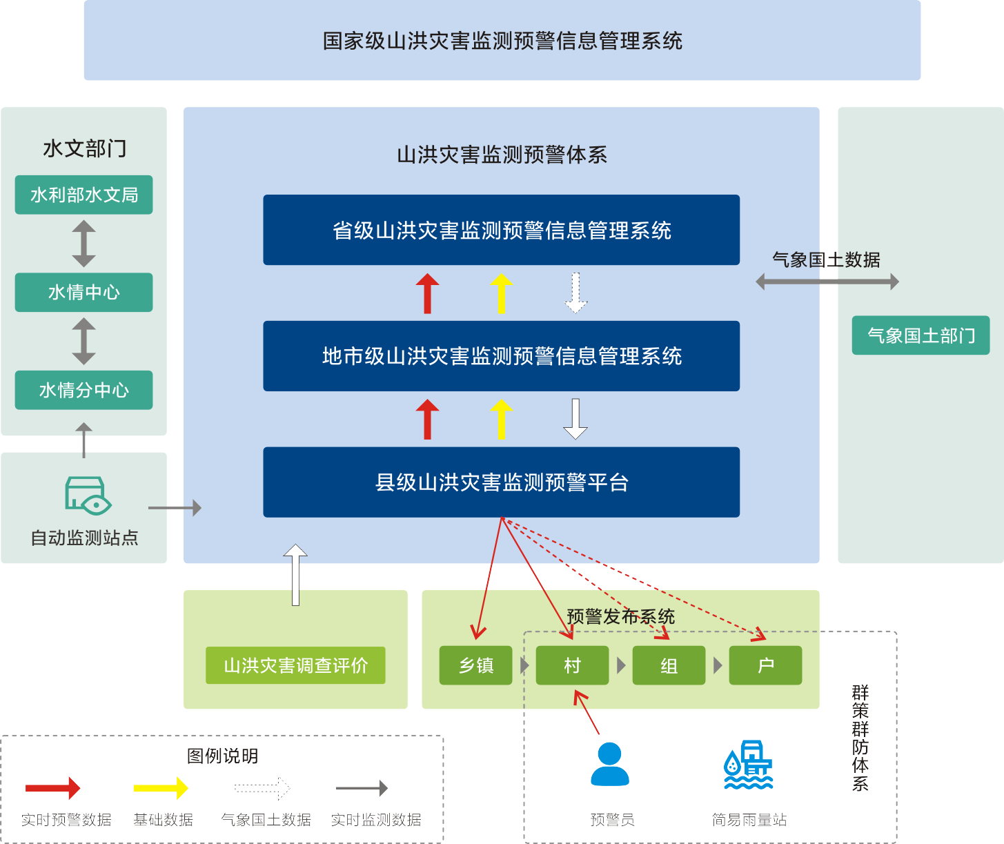 在易于發(fā)生洪澇災(zāi)害的區(qū)域建立以監(jiān)測、通信、預(yù)報(bào)、預(yù)警等非工程性措施為主并與工程措施相結(jié)合的防災(zāi)減災(zāi)體系,減少群死群傷事件和財(cái)產(chǎn)損失。山洪災(zāi)害監(jiān)測預(yù)警平臺(tái)集信息采集、傳輸、分析和預(yù)警等多功能于一體,及時(shí)準(zhǔn)確地上傳下達(dá)預(yù)警信息,從而使可能受災(zāi)區(qū)域能夠及時(shí)采取措施。