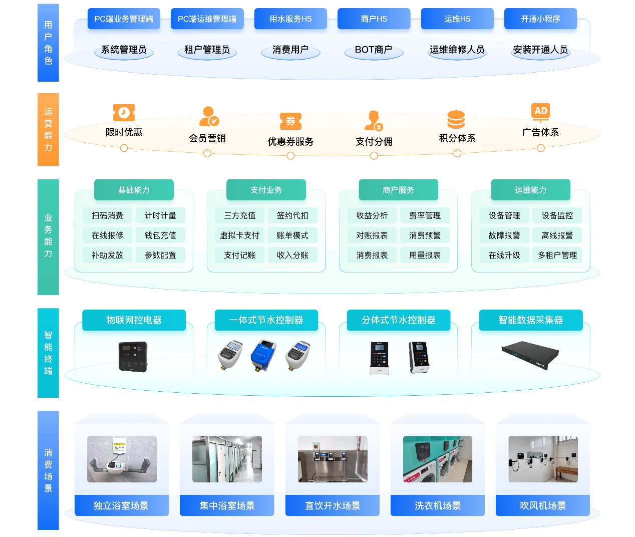 校園生活智慧服務(wù)平臺(tái)集成用水、洗衣等多類生活場(chǎng)景,打通用戶、商戶、運(yùn)維及管理人員全角色閉環(huán)服務(wù)。平臺(tái)依托智能終端與云端協(xié)同,提供集中監(jiān)控、多元支付、智能營(yíng)銷和實(shí)時(shí)預(yù)警等功能,顯著提升運(yùn)營(yíng)效率與用戶體驗(yàn)。