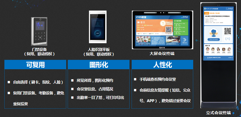 新開普為企業(yè)提供智慧會議簽到系統(tǒng),滿足企業(yè)會議室預(yù)定、會議簽到和會議出勤情況統(tǒng)計分析等會議事務(wù)管理需求,避免會議室等資源的浪費與重復(fù)投資,同時支持刷卡、掃碼、指紋和人臉等識別方式,并可與考勤、門禁系統(tǒng)聯(lián)動,盤活各方角色數(shù)字化資源,獲得高效、協(xié)同、互動、整體的效益,實現(xiàn)云化辦公、移動辦公和協(xié)同辦公。