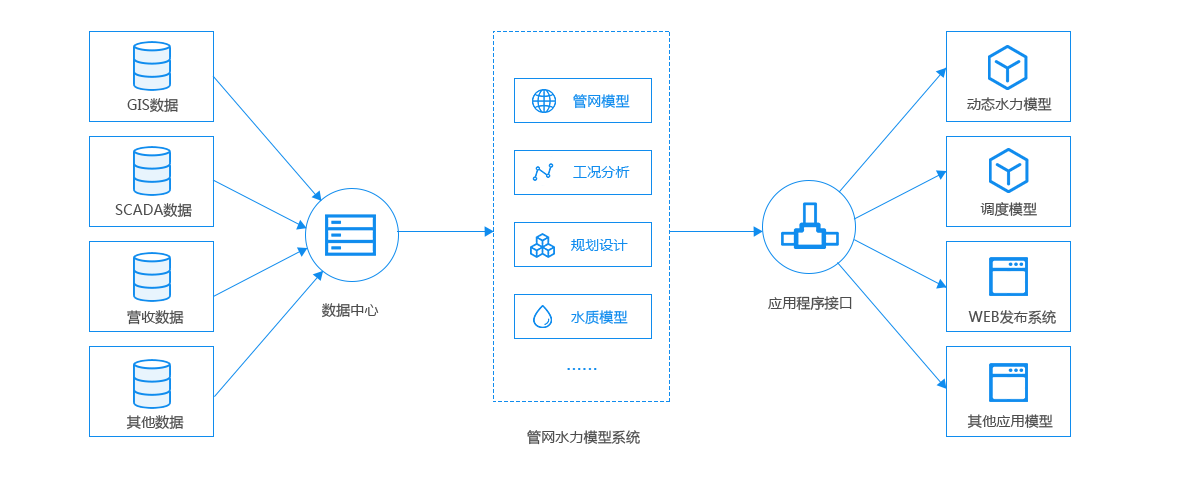水力模型系統(tǒng)結合管網(wǎng)GIS地理信息系統(tǒng)的靜態(tài)信息與SCADA系統(tǒng)的動態(tài)信息,并結合供用水量的預報、估算與分配,按照水力學理論對水司供水系統(tǒng)進行水利建模與模擬計算,在線實時跟蹤供水系統(tǒng)的水力運行狀態(tài),實時計算出所有管道的流量、壓降、流速和水廠、用戶節(jié)點的壓力以及水質(zhì)等重要數(shù)據(jù)信息,為供水系統(tǒng)的科學調(diào)度與管理提供依據(jù)。