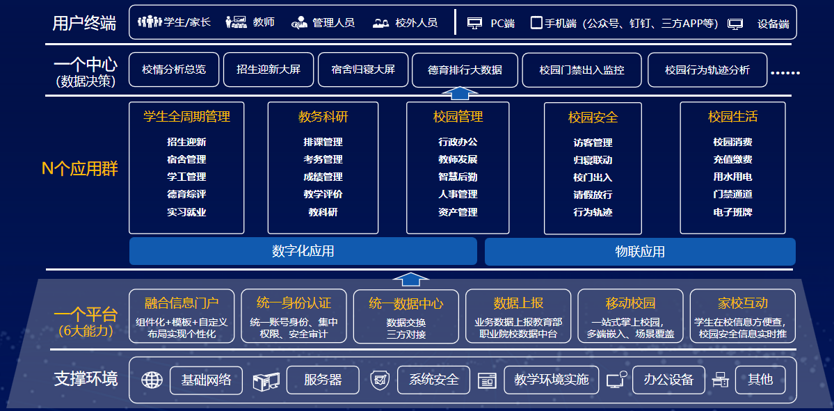 基于“1+N+1”建設(shè)理念,一站式服務(wù)平臺(tái)提供融合信息門戶、統(tǒng)一身份認(rèn)證、統(tǒng)一數(shù)據(jù)中心、數(shù)據(jù)上報(bào)、移動(dòng)校園、家校互動(dòng)六大能力,N個(gè)應(yīng)用群覆蓋學(xué)生全周期管理、教務(wù)科研、校園安全、校園生活、校園管理五大類型場景,一個(gè)中心匯聚各類場景數(shù)據(jù),打破數(shù)據(jù)壁壘,消除信息孤島,實(shí)現(xiàn)管理者對(duì)各項(xiàng)工作的全面把控和精細(xì)化管理,助力學(xué)校領(lǐng)導(dǎo)科學(xué)決策。