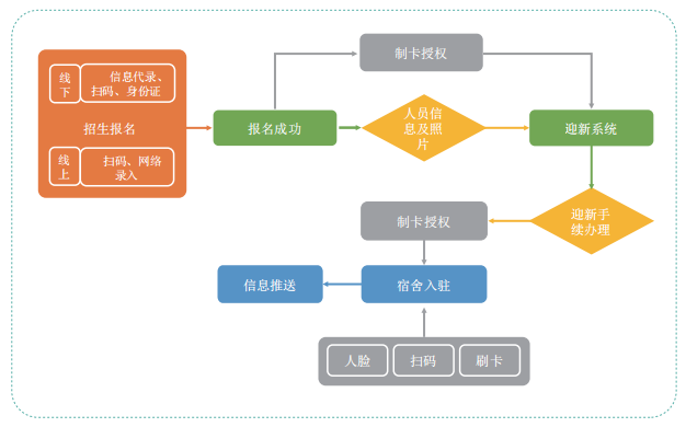 招生管理系統(tǒng)、迎新管理系統(tǒng)、宿舍管理系統(tǒng)、請銷假管理系統(tǒng)、訪客管理系統(tǒng)通過與身份證讀卡器、攝像頭、人臉識別、一卡通、閘機(jī)通道,水電、安防等智能設(shè)備的融合,可快速精準(zhǔn)采集報名信息、快速辦理迎新手續(xù)流程;規(guī)范學(xué)生住宿管理情況;實時掌握學(xué)生請銷假動態(tài);加強(qiáng)訪客管理,提升校園安全。